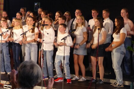 Unter der Leitung von Ricarda Junghardt sangen die Jugendlichen Stücke der letzten 40 Jahre von Bohemian Rhapsody bis hin zum Abba-Medley. Zwischendurch gab es auch immer wieder Lieder zum Mitsingen für das Publikum, welches anfangs zögerlich, aber am Ende begeistert mitsang. Extraapplaus gab es für die Solisten aus den eigenen Reihen – hier trauten sich auch bereits die Jüngsten allein oder in Kleingruppen ans Mikrofon.